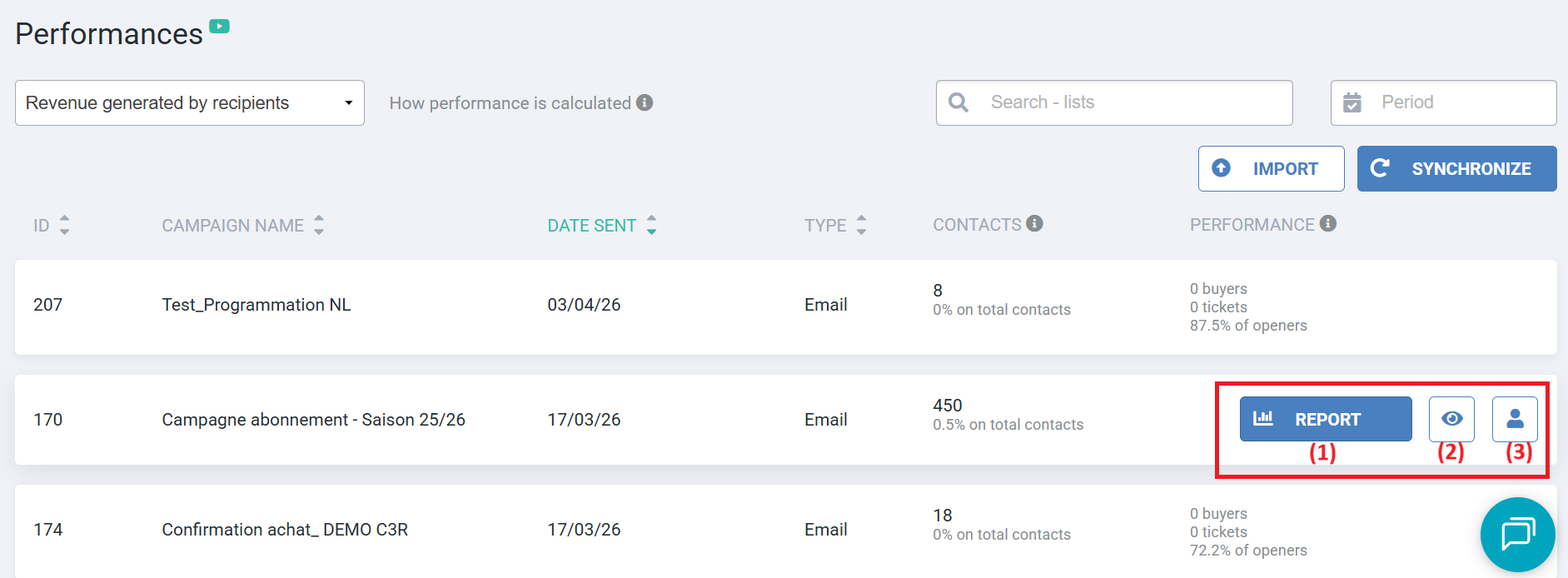 Performance: allows you to estimate the ROI of a campaign, based on either openers or recipients. The calculation sums the value of tickets purchased by these contacts on the same day and up to 7 days after the campaign was sent (i.e. an 8-day period). It does not take into account the exact time of purchase or sending.
