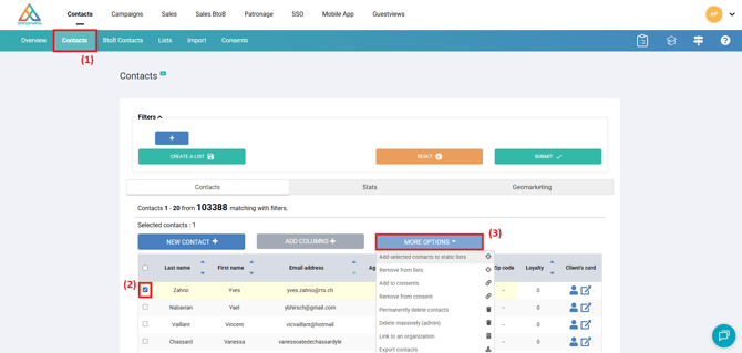Go to the Contacts tab (1) and search for your contact (see Search for a contact). Once you have found the contact, check the box to the left of the contact to select it (2).