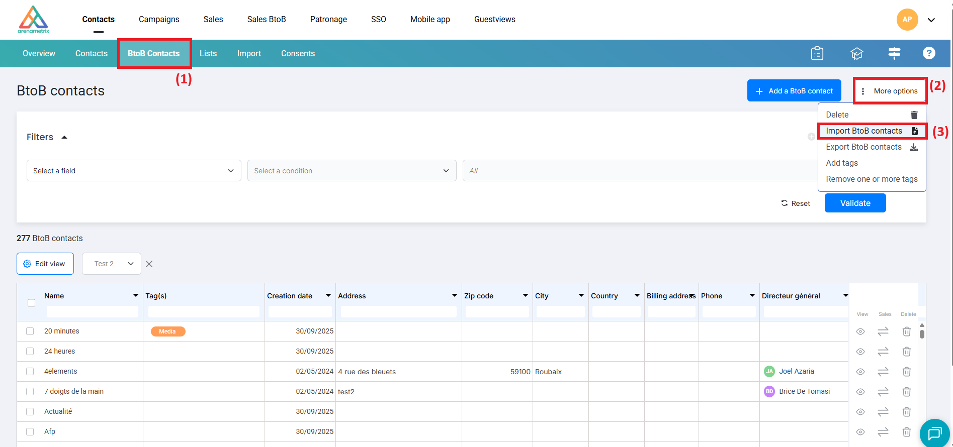 To import structures, go to the Contacts tab, then click BtoB contacts (1). Next, click Options (2), then Import BtoB contacts (3).