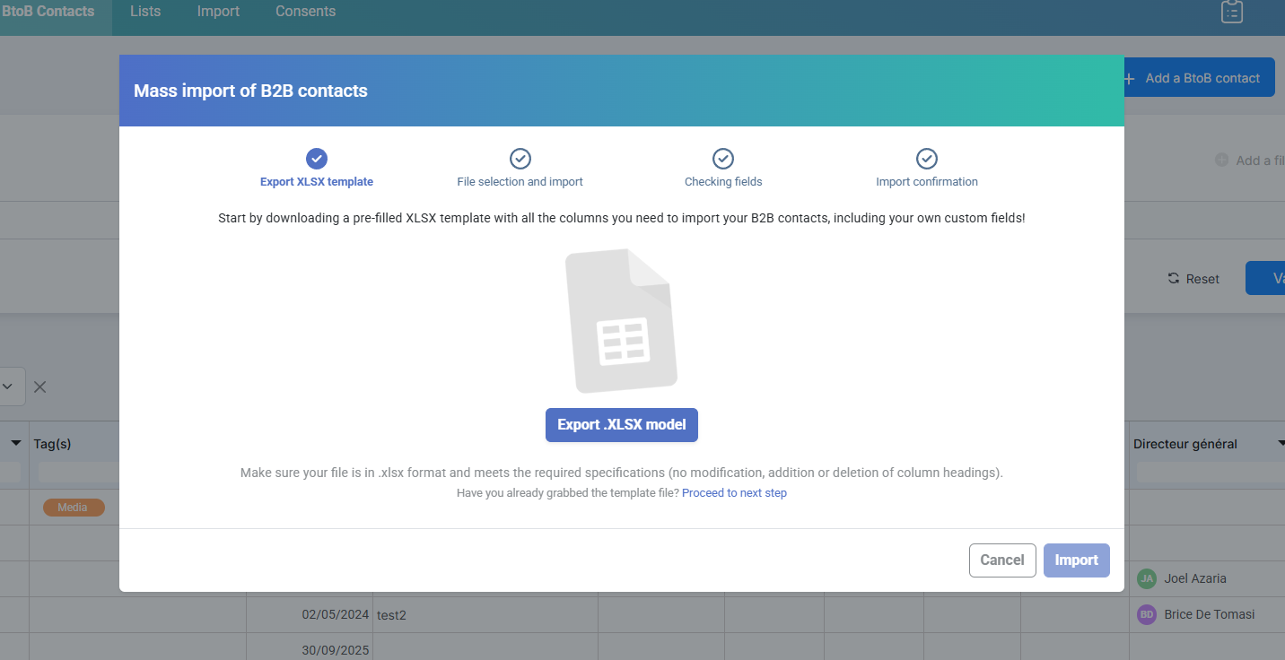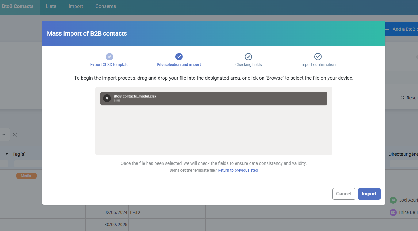 Importing BtoB contacts follows the same logic as manually importing contacts. For the general process of an import, you can refer to the article Import a contacts file.