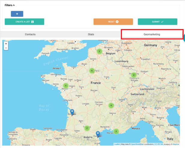 Here as well, when you apply a filter, the map updates to reflect the selected population. To access it, go to the Contacts page and click on Geomarketing.