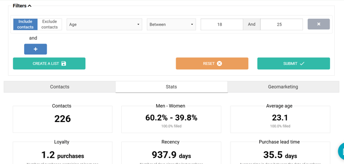 Here you can find the overall statistics for your entire contact database (number of contacts, gender distribution, average age, loyalty, recency and purchase delay), without segmentation.