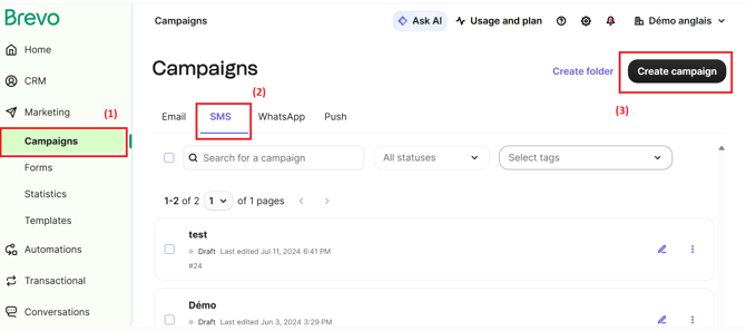 Here is how to create an SMS campaign in three steps. Go to the Campaigns page (1) in Brevo, select SMS (2), then click Create a campaign (3).