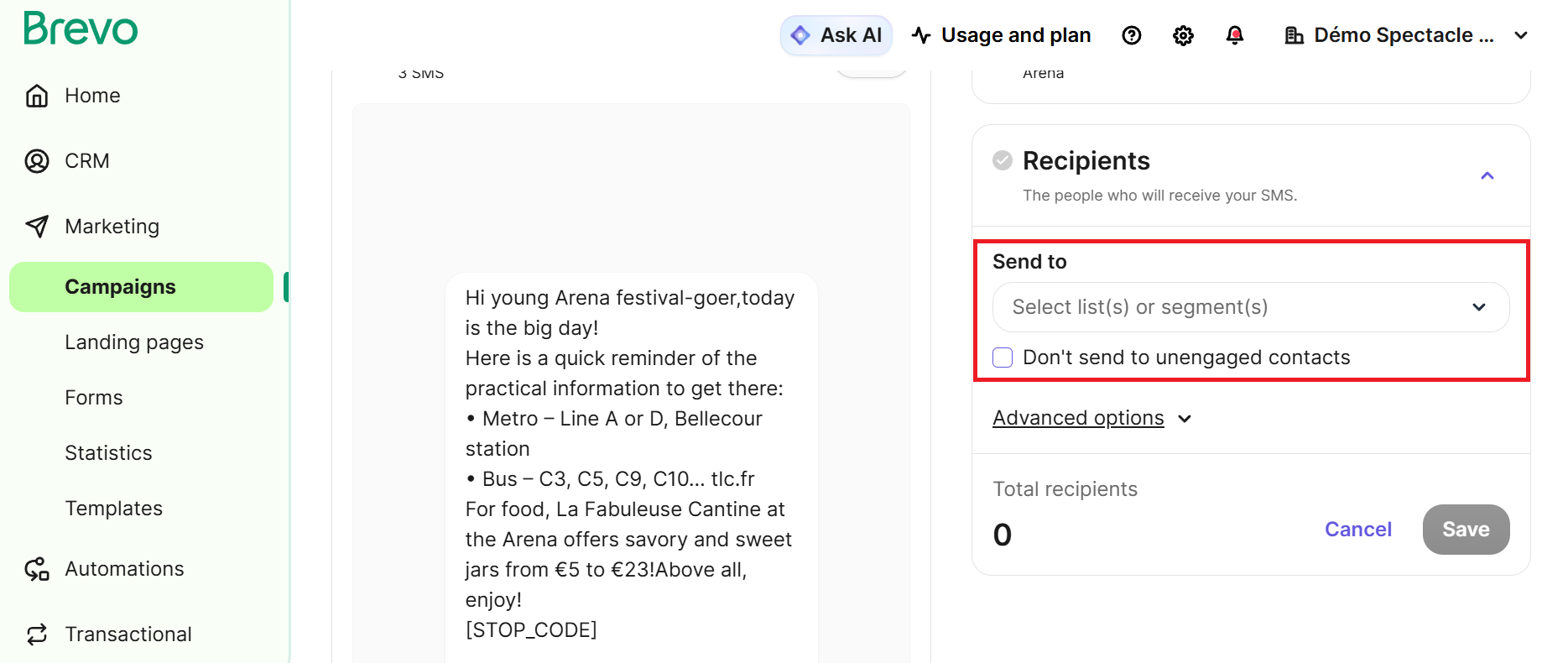 This step allows you to choose the list(s) of contacts who will receive your SMS campaign.