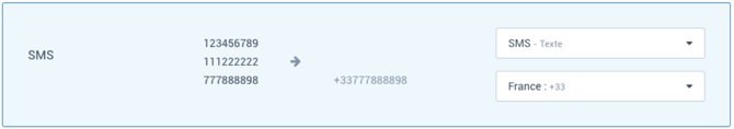 For a list to be used in an SMS campaign, phone numbers must be stored in the SMS field. They must contain only digits, with no spaces or special characters, and include the country code (e.g. +33 for France).