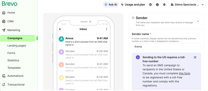 SMS campaigns sent to the United States require prior sender configuration and validation. Without this step, the campaign cannot be sent.
