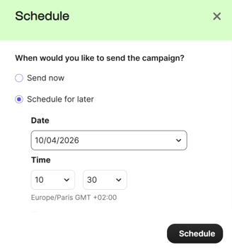 You can choose to send your campaign immediately or schedule it for a later date and time. Please note that telecom operators do not allow marketing SMS to be sent between 8:00 PM and 8:00 AM, nor on Sundays and public holidays. It is therefore recommended to avoid sending large volumes of SMS late in the evening.