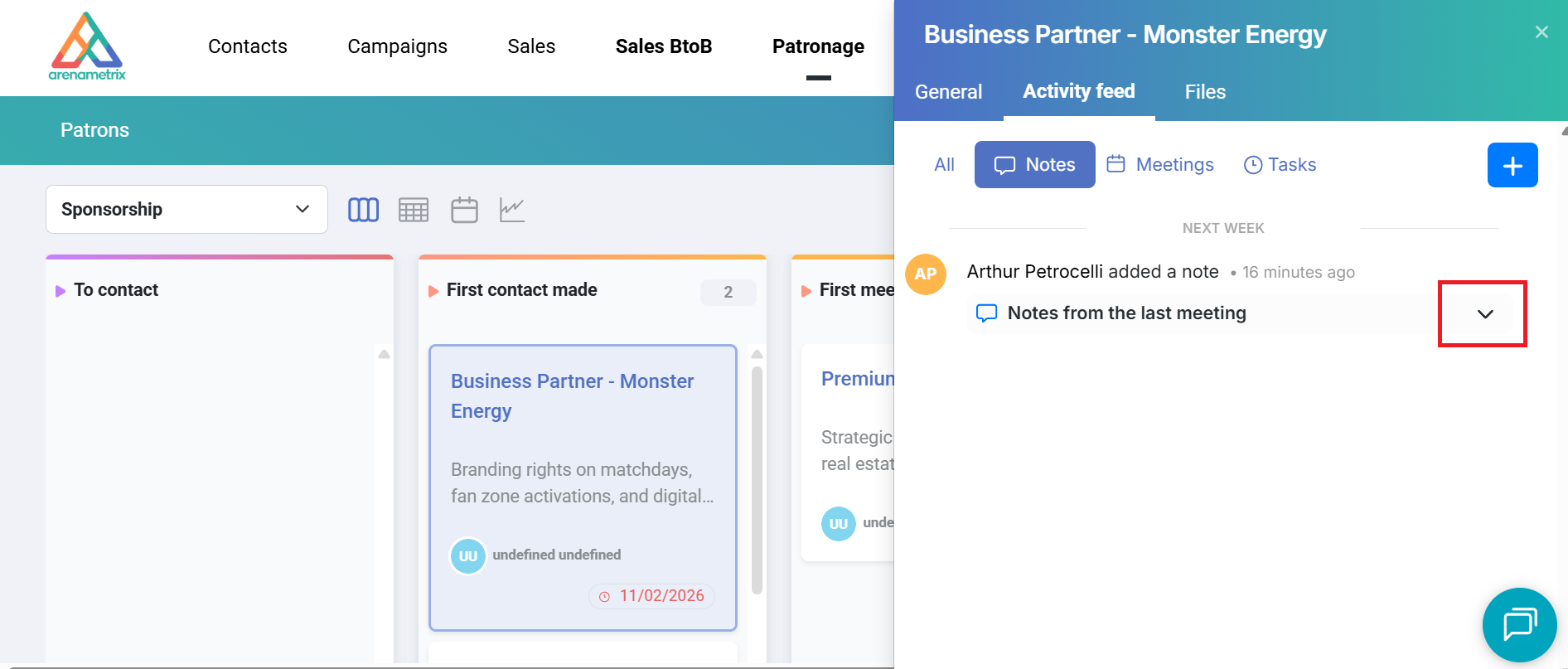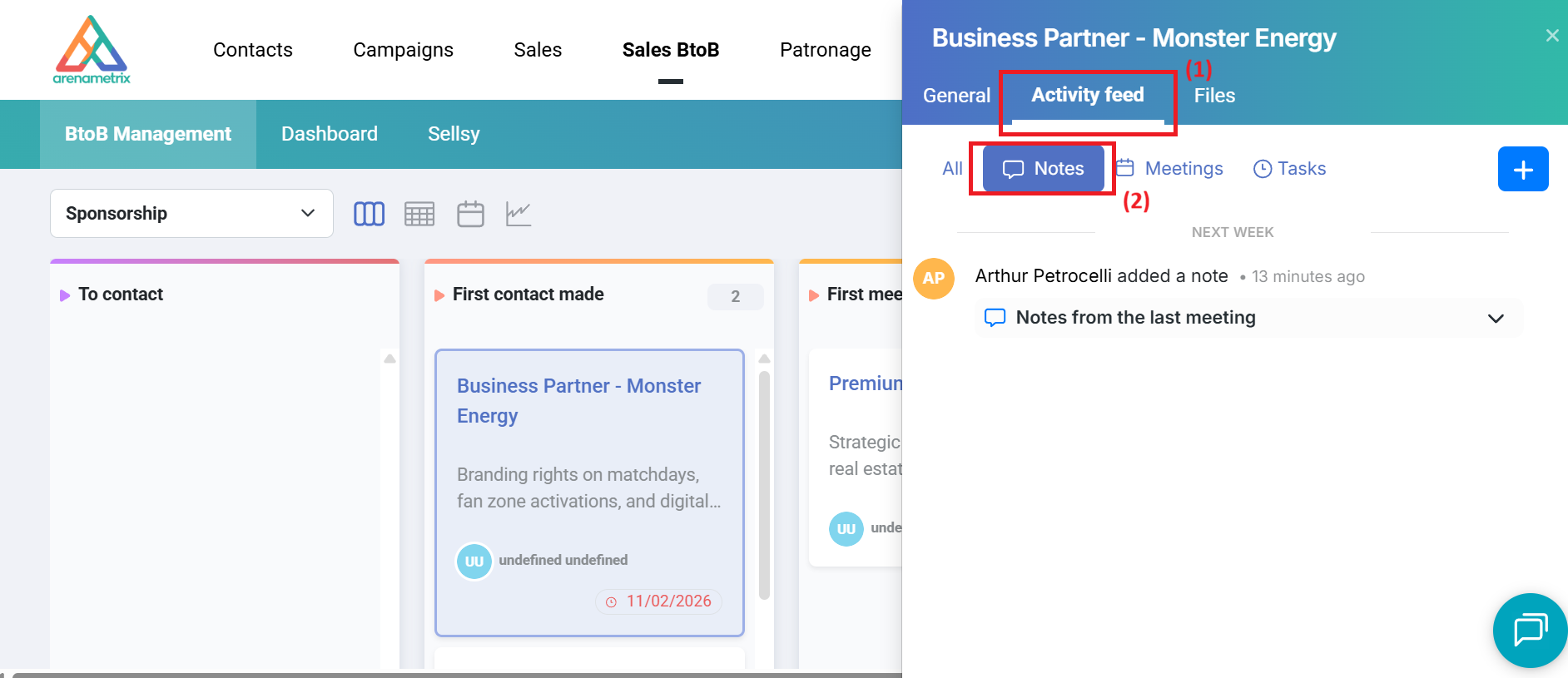 In the side panel that opens, go to the Activity feed tab (1), then Notes (2).