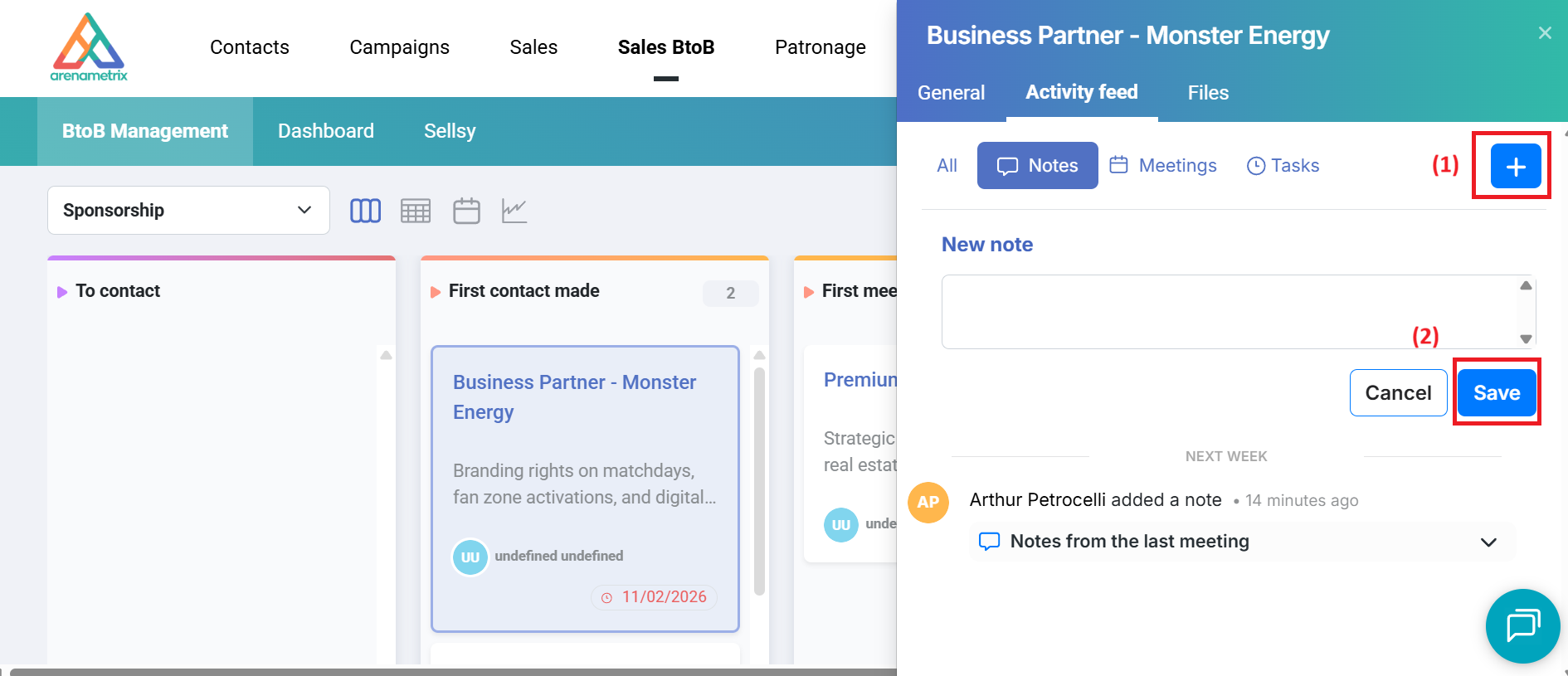 To add a new note, click the + (1), fill in the fields, then click the Save icon (2).