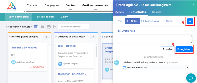 Dans la fenêtre latérale qui s’affiche, cliquez ensuite sur l’onglet Fil d’activités (1) puis Notes (2):