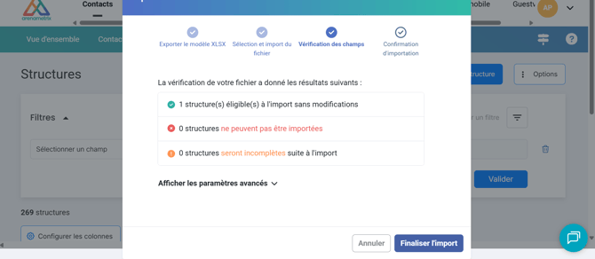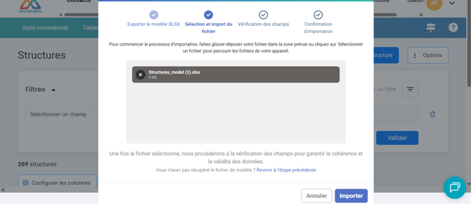 Une fois votre fichier Excel complété avec l’ensemble des structures à importer, il vous suffit de sélectionner votre fichier, puis de cliquer sur Importer.