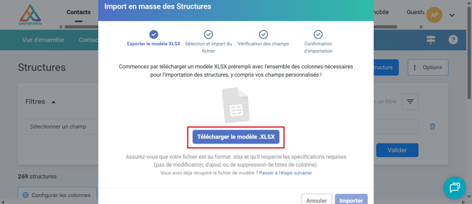 Puis, vous pouvez télécharger le modèle .XLSX afin de disposer du gabarit nécessaire à l’import des structures.