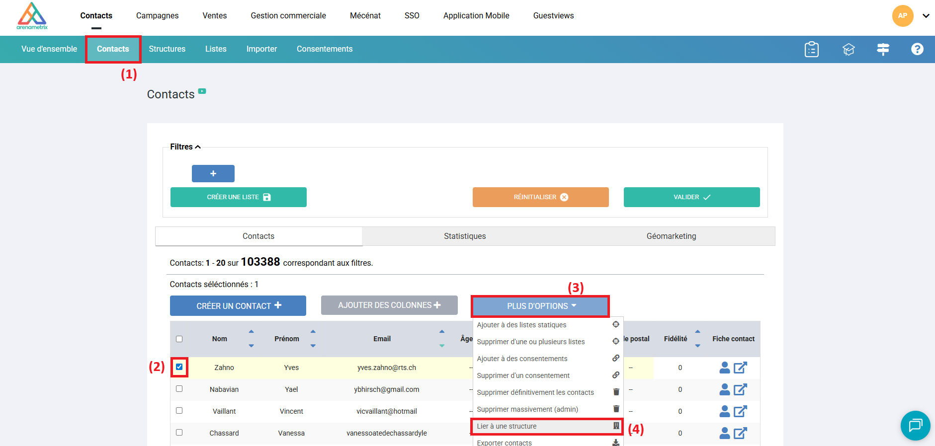 Rendez-vous sur l’onglet Contacts (1) et recherchez votre contact (cf. Rechercher un contact). Une fois votre contact trouvé, cochez la case à gauche de son nom de famille afin de le sélectionner (2).