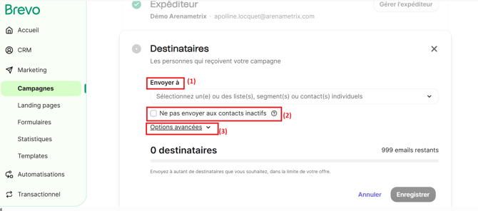 Il est également possible de ne pas envoyer la campagne aux contacts inactifs en cochant l’option correspondante (2). Les contacts concernés seront automatiquement retirés de la liste des destinataires.