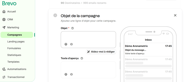 Cette étape vous permet de renseigner l’objet de votre campagne. Vous avez la possibilité d'ajouter une variable {} qui vous permettra de personnaliser votre objet avec différents attributs (ex: prénom).