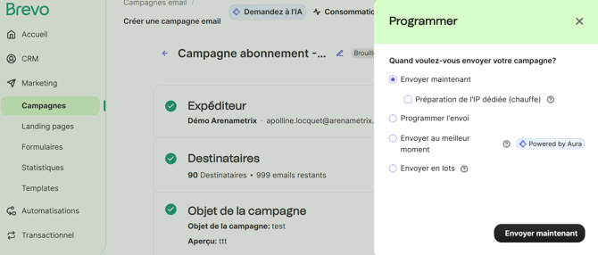 Une fois l’option choisie, cliquez sur Envoyer maintenant pour finaliser l’envoi de la campagne.