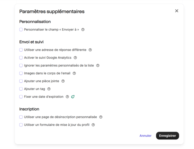 Avant l’envoi, plusieurs paramètres supplémentaires peuvent être configurés dans Brevo.