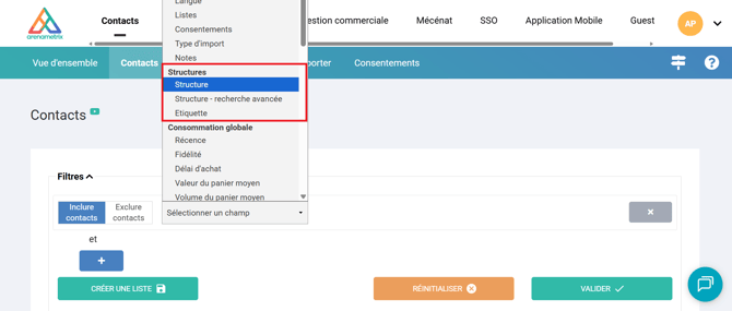 Parmi tous les champs de segmentation disponibles, on retrouve Structure, Structure - recherche avancée et Étiquette. Sélectionnez alors la structure ou l’étiquette souhaitée afin de retrouver l’ensemble des contacts correspondants.