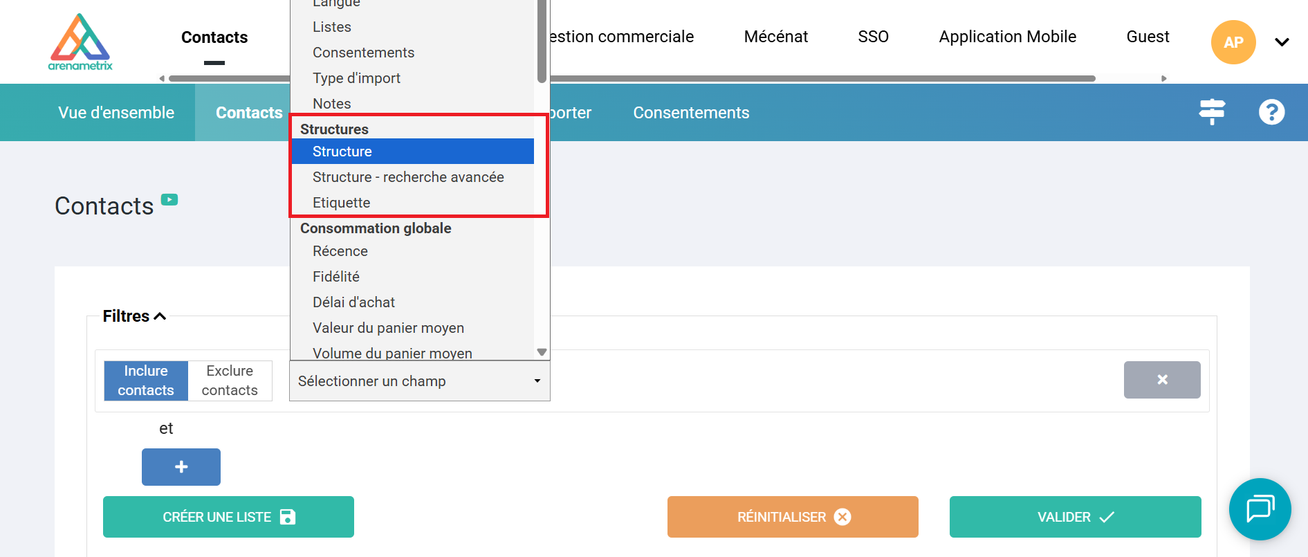 Cliquez ensuite sur Valider pour afficher les résultats ou sur Créer une liste pour enregistrer cette sélection et la réutiliser ultérieurement.