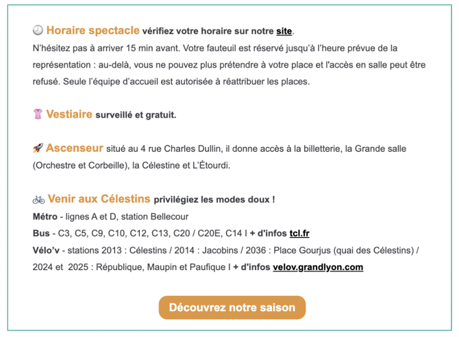 - Apporter une information complémentaire qui n’est pas apportée par le mail automatique qui part de votre billetterie.