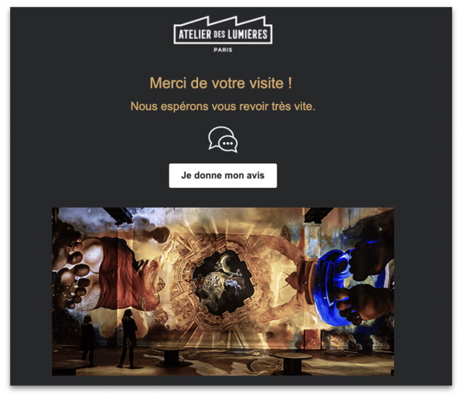 Le mail d’après-visite permet généralement de demander à un spectateur de donner son avis sur son expérience (NPS, enquête…). Mais il peut-être utilisé pour poursuivre d’autres objectifs :